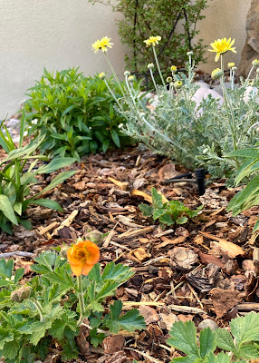 Planted the tiny Blackfoot daisies out among the rocks at the driveway corner today. Sheesh. Mojave sage (all 8 of the ones I planted) croaked. The dwarf lavender did too. The horehound marrubium never reappeared this spring. This is the Corner of Death.